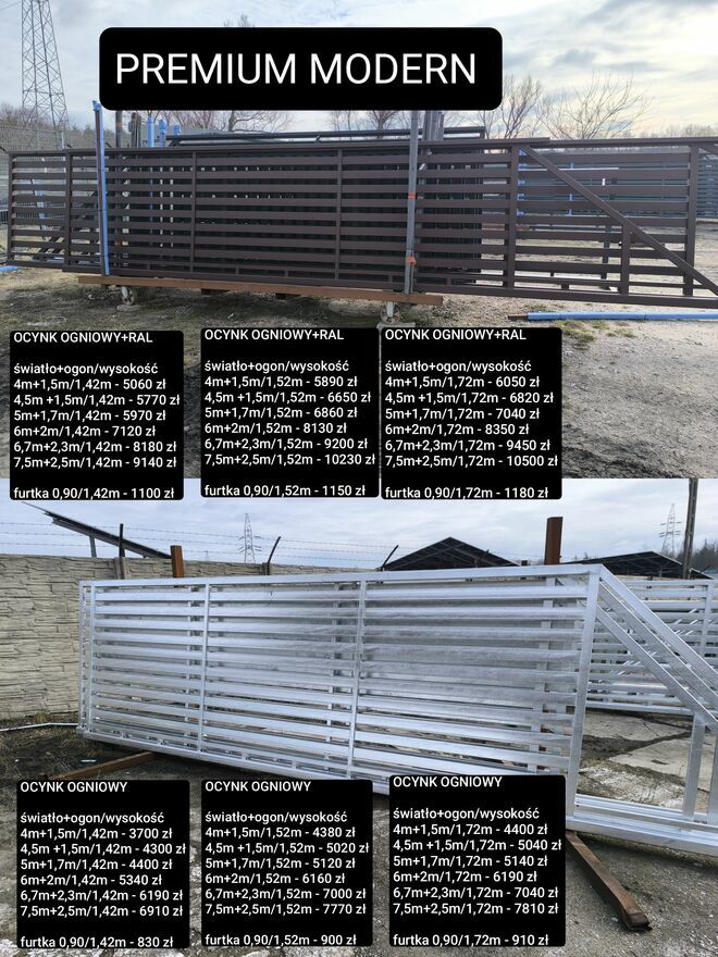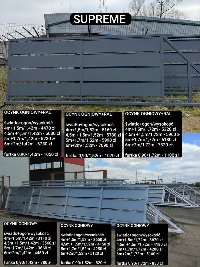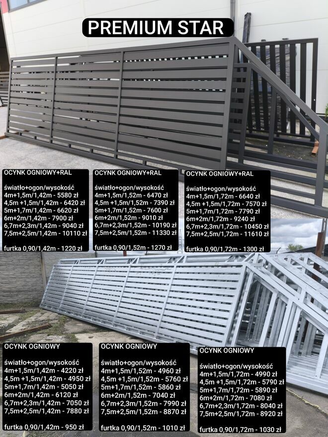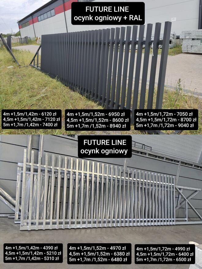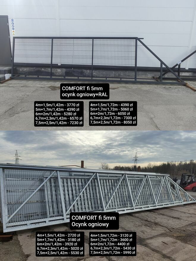 Na przedstawionych zdjęciach podane są ceny bram z słupkiem utrzymującym bramę w pionie i słupkiem najazdowym bez kosztów transportu oraz kosztów akcesorii.