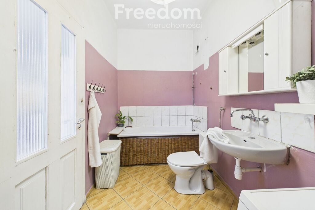 umywalką i WC. Na podłogach panele, lastriko oraz płytki. Okna