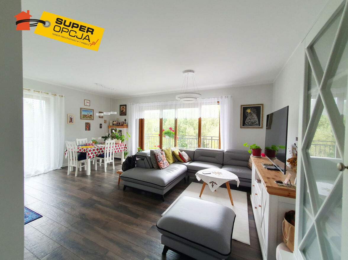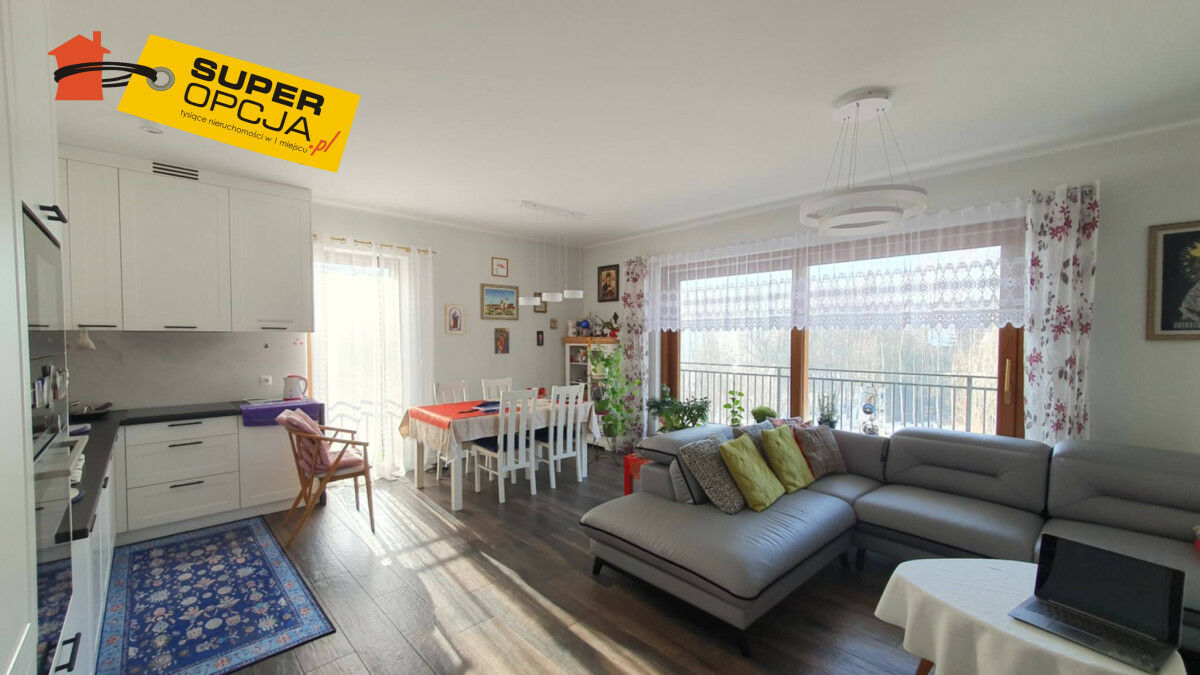 słoneczny salon z aneksem i wyjściem na balkon z widokiem na zagajnik