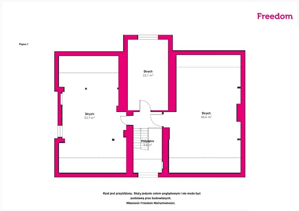 prowadzący na poddasze (107m2), klatkę schodową, piwnicy (61m2)